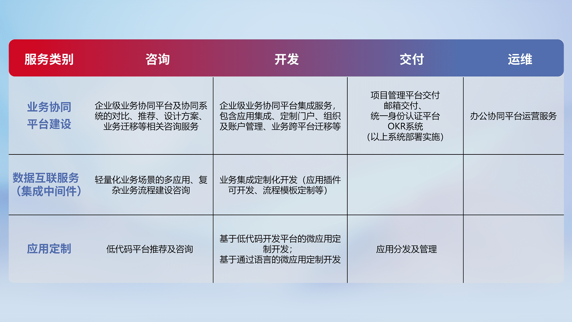 针对钉钉、、、、企微、、IDaas等平台级产品提供产品的规划、、方案、、、交付、、、定制化开发等服务,,,,实现如统一协同办公、、智能客户服务、、、、混合会议管理、、智能数据查询、、、等业务场景,,,实现数字化转型。。。