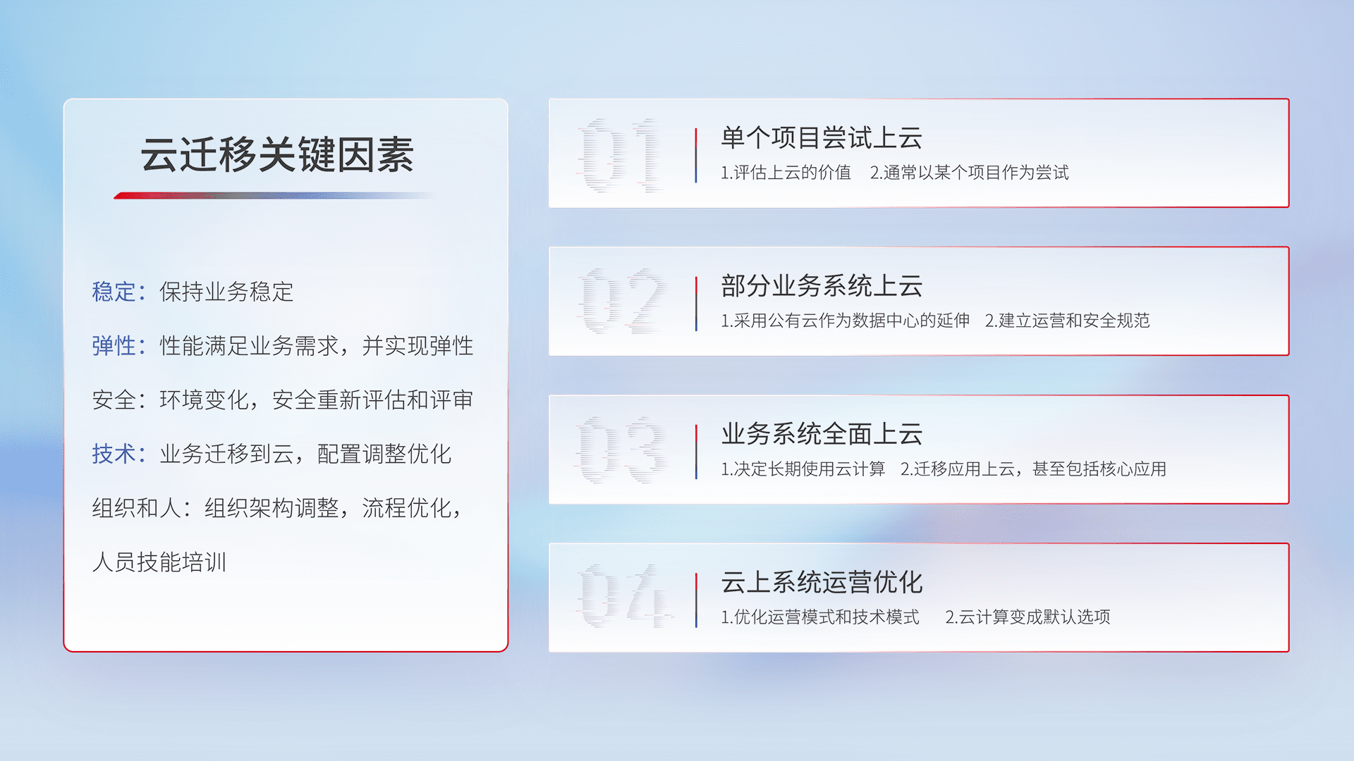 结合实际业务,,从规划设计、、、、云平台选型、、云原生改造、、、、数据迁移、、、集成交付,,迁移全过程为客户识别最佳上云路径,,做好风险识别管理,,设计网络架构、、、身份权限、、、安全审计合规、、操作审计、、、、日志审计、、监控告警策略、、多站点容灾设计等,,,,对云上基础设施进行整体规划,,,提升IT治理水平,,以满足弹性、、、、高可用、、、高性能的需求。。。