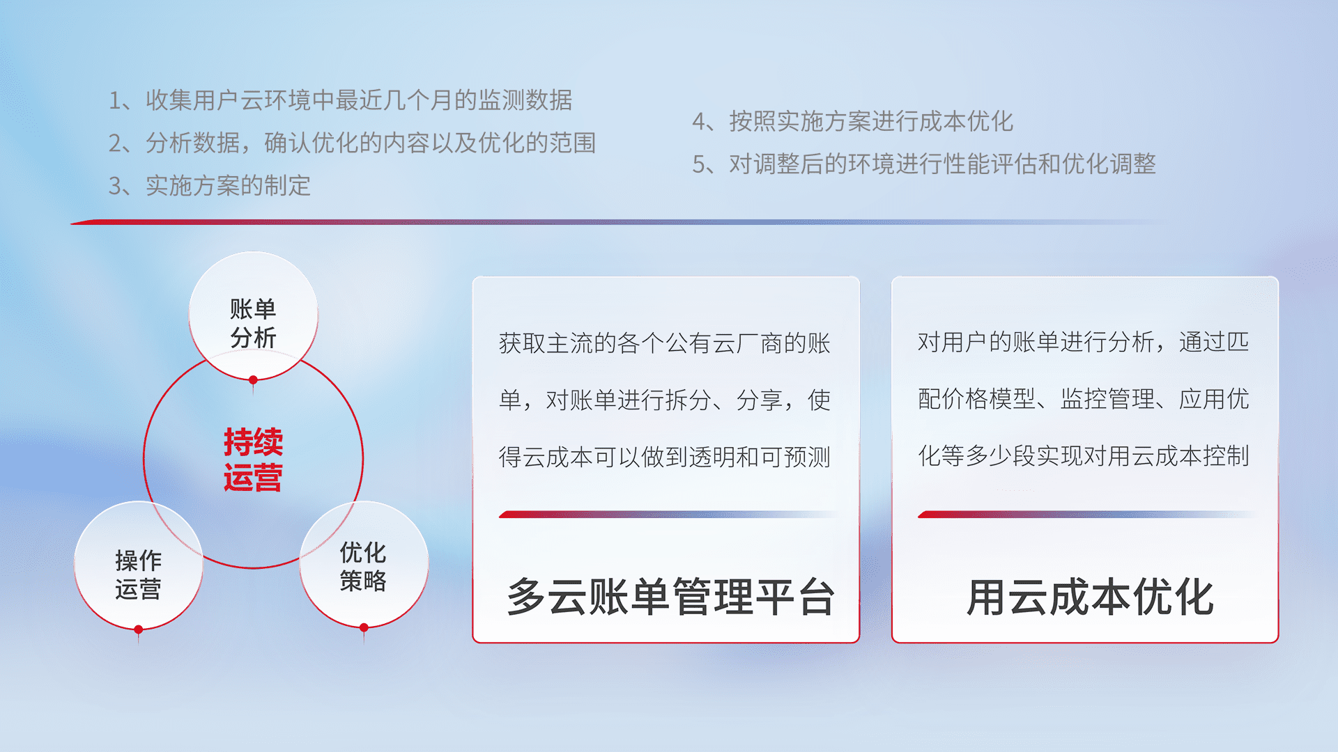 通过多云纳管,,以统一的资源数据模型把客户的云资源进行抽象和封装,,,进而实现对多云资源的统一操作,,,保障云资源管理的可靠性、、、稳定性与可用性。。。量身定制化运维内容,,配置、、开发运维、、补丁管理、、备份、、、监控、、、、认证和访问管理、、、审计和日常巡检等,,,保障在用云过程中的可靠度,,,稳定度以及高可用率。。。